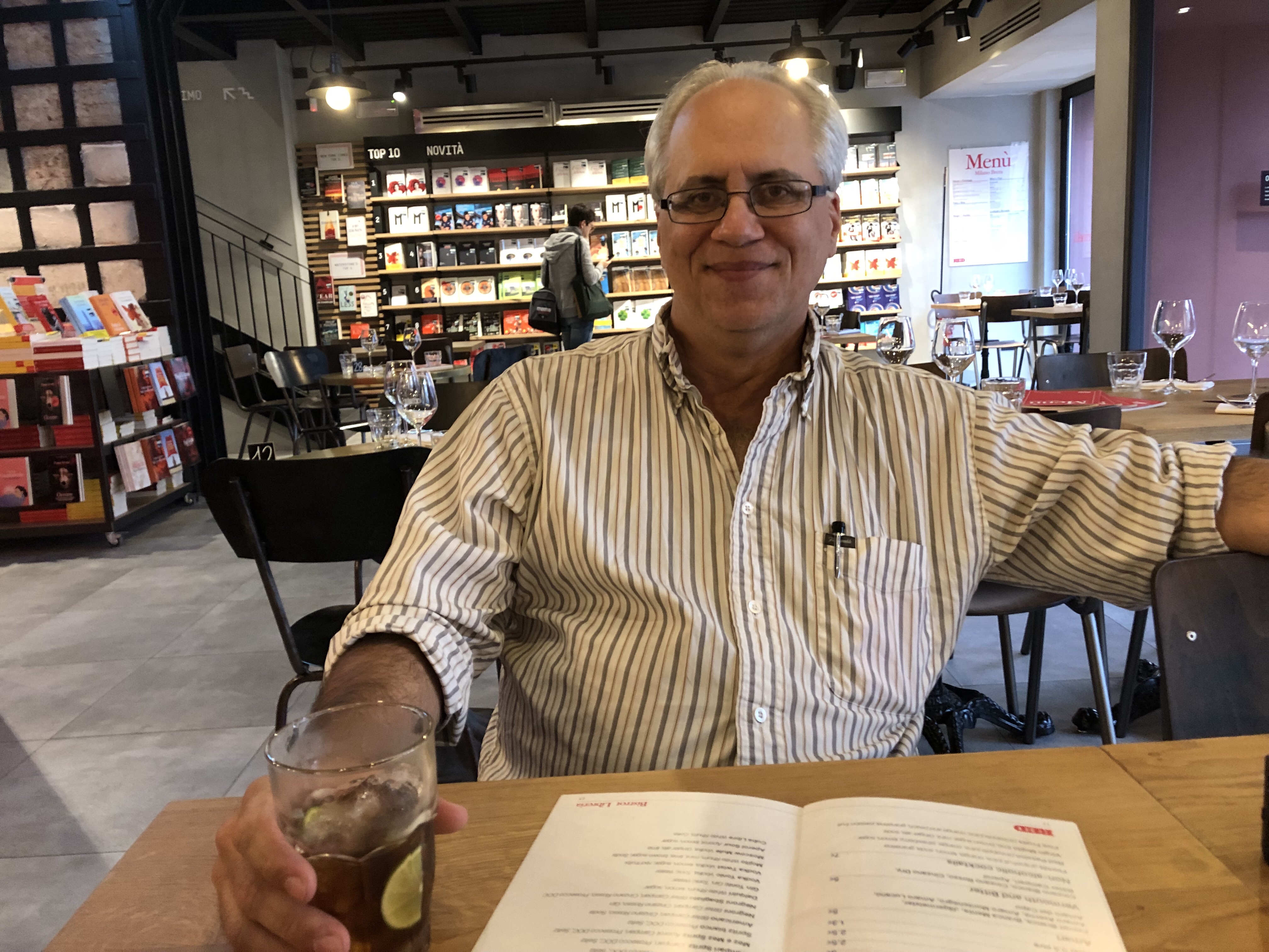 Signore Savoie enjoying an aperitif in the bookstore.