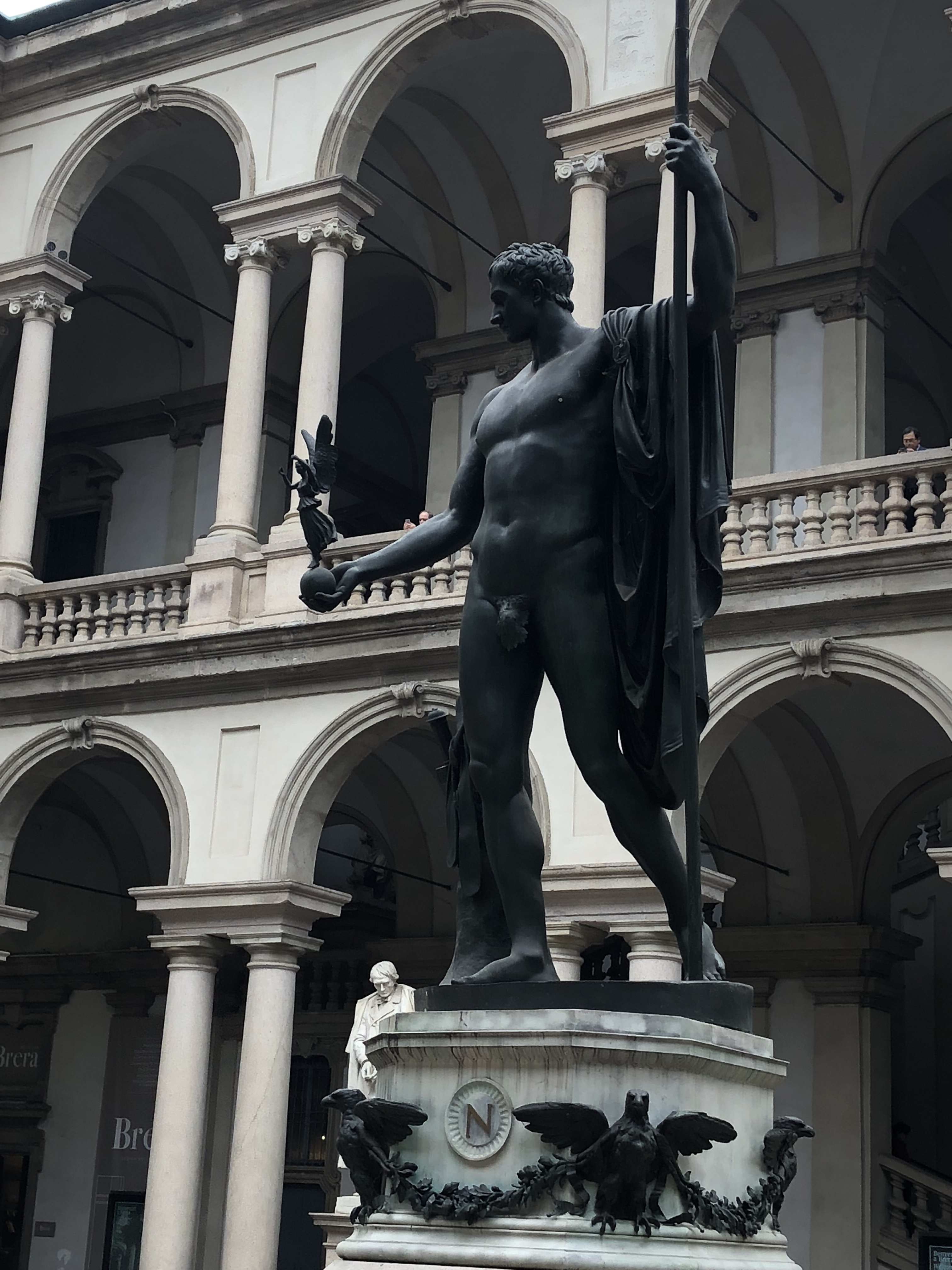 As we started on our journey, I saw an interesting passage off to the right and veered off that way. Tony noted how comfortable I was in going off the beaten path. But, really, it’s a city. You’re not going to get that lost. This got us over toward La Scala, the opera house and the statue of Leonardo in front of it. I had Tony take a picture of me with Leonardo standing on my shoulder. Nyuk, Nyuk… Nancy Doyle has some connection with La Scala through the Marlboro Music Festival so we were hoping to go to its museum but never did.