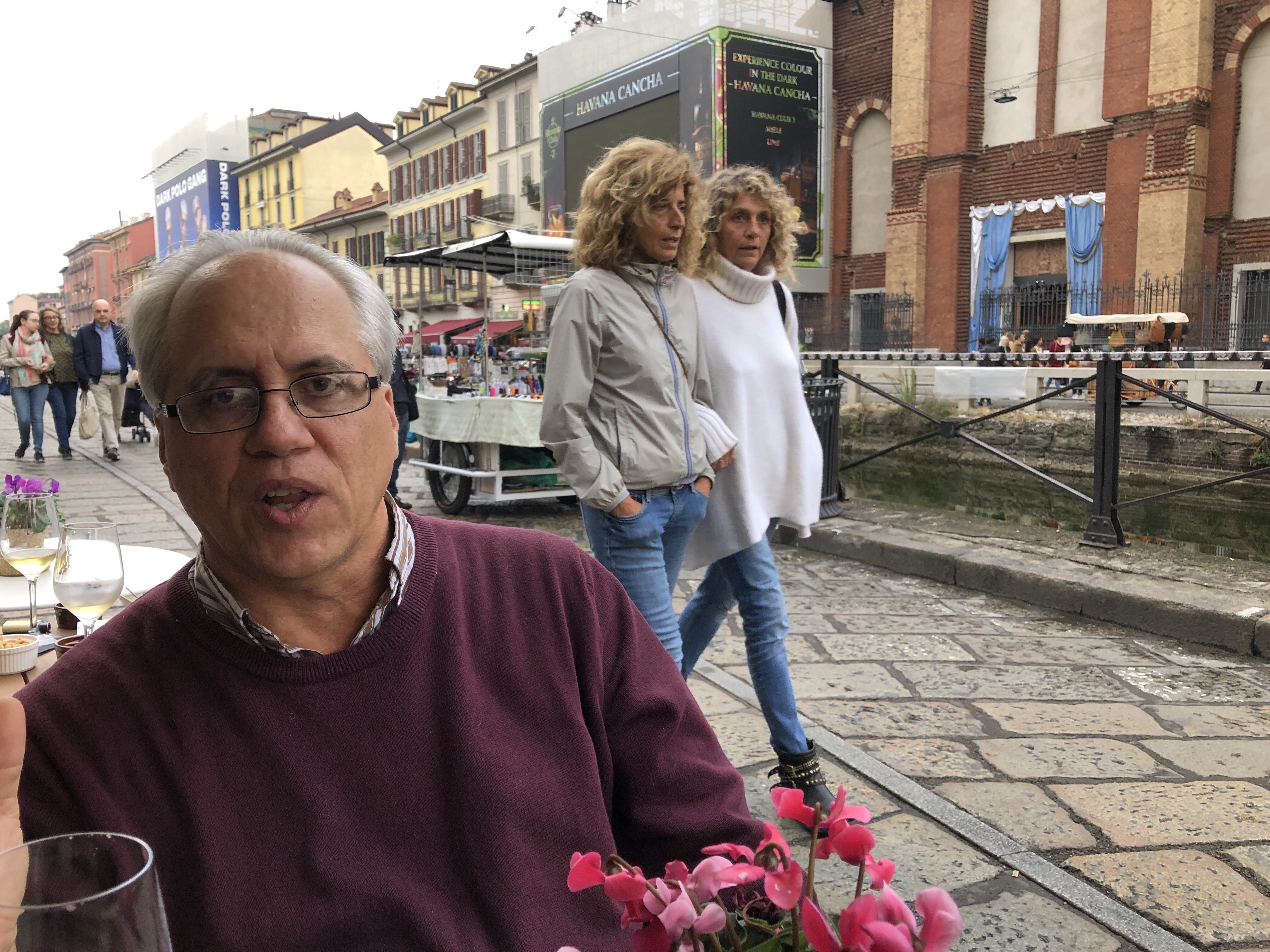 Finally, a tram ride and a short walk and we’re back at our hotel, once again hanging out on the sidewalk and people watching (but now at midnight)—just like the dozens of Milanesi around us.