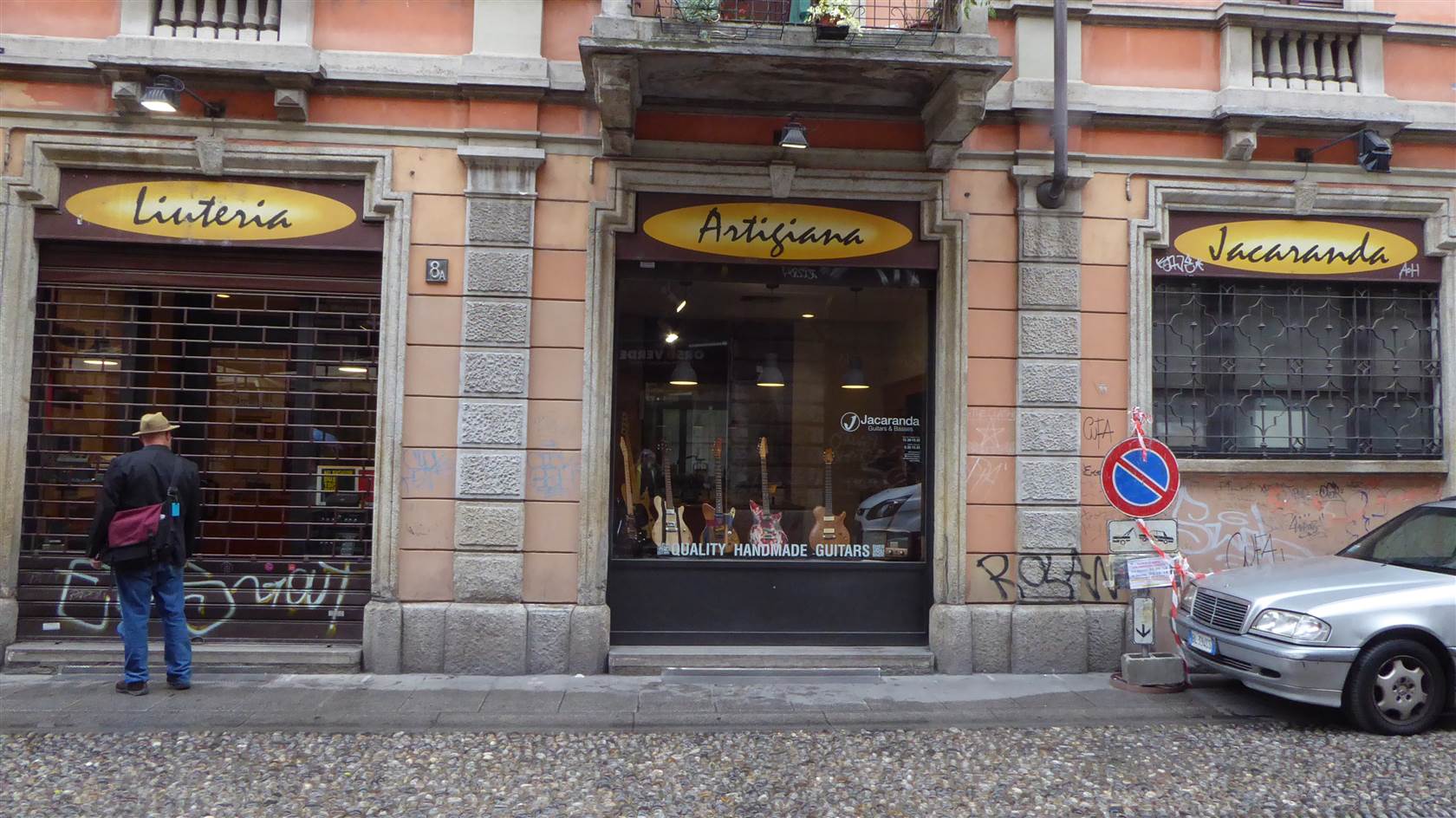 Serendipity. Friday night Harry bought a nice book on the sights of Milan. While having coffee outside and people watching on Saturday morning I find an entry in the book about a cool luthier shop, so we add it to our increasingly long list of possibilities. We head out on our walk, through the Brera art school district, La Scala opera house, the fancy stores in the Galleria, and the cathedral, all close to each other and all stuff we had planned for the day before the Zappa concert on Sunday. It starts to rain to so we give up on going up to the roof of the cathedral, and find a place for lunch (and shelter). The lunch is so good, and leisurely, that by the time we’re done, I realize the luthier shop (“liuteria”) is now closed. We decide to head out anyway and at least look through the windows. It also gives us a chance to hop a tram, which Harry was hoping to do, and the place is near the canal district (Navigli) of Milan which is supposed to be pretty cool, in a bohemian sort of way.